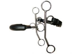 Bocado Hackamore Hervé Godignon con efecto de palanca poderoso (pronunciado por la longitud de las barras). Viene con una cadenilla de cuero. La parte que se basa en la cara es movible para proporcionar más o menos dureza. Tamaño único.