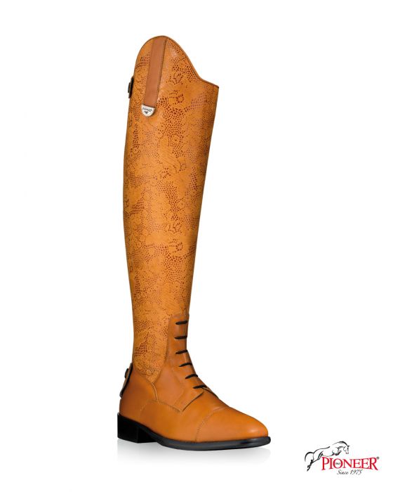 Bota en piel suave con estampado de flores o fantasía, con cremallera trasera y fuelle elástico delantero.
