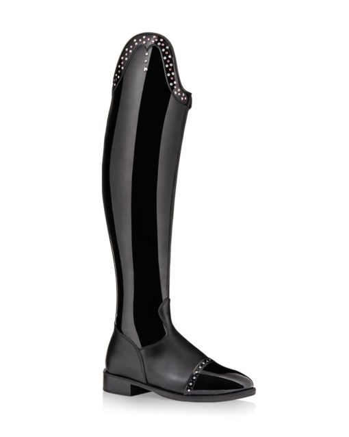 Botas de doma Borea: botas de doma altas completamente hermosas con detalles que te enamorarán desde el primer vistazo. El charol en combinación con la delicada decoración de Swarovski en la parte superior y el pie le da a estas botas un aspecto lujoso y elegante sin exagerar. Con una cremallera frontal y refuerzo exterior, estas botas de doma te asegurarán que te veas mejor cuando compitas. Principales características: Bota de doma de cuero barnizado con cremallera frontal y banda interior en cuero elástico verdadero o cuero Decoración de punta y punta con Swarovski Suela de cuero totalmente cosida Fuerte refuerzo en la pierna Personalización disponible Hecho a medida para garantizar el ajuste perfecto Disponible en negro, marrón caoba, azul (azul marino), marrón, bronce, rojo o azul océano