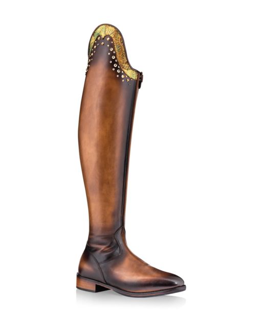 Botas de doma Zea – una verdadera obra de arte, estas increíbles botas altas de doma con cremallera frontal son algo especial. Los exquisitos detalles a lo largo de la parte superior del corazón, en combinación con el cuero de estilo vintage, les dan un aspecto único pero completamente atemporal. Principales características: Decoración superior del corazón con Swarovski (personalización completa disponible) Botas de doma estilo «vintage» en piel engrasada con cremallera frontal y en el interior en piel o cuero elástico verdadero Suela de cuero totalmente cosida Fuerte refuerzo en la pierna Personalización completa disponible Hecho a medida para el ajuste perfecto Disponible en marrón Tamaños: EU35 – EU36 Nota importante, todas las botas Pioneer se hacen por encargo. Tiempo de entrega de aproximadamente 3-6 semanas.