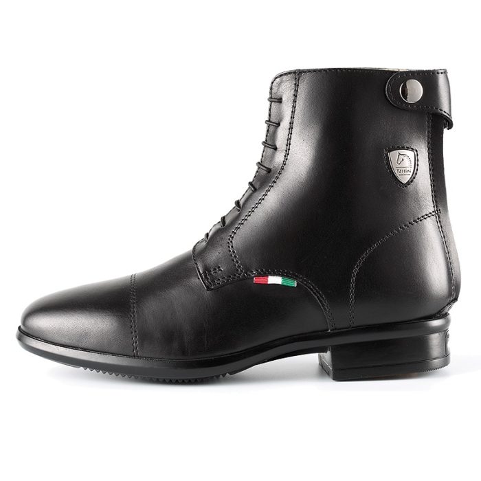 En piel de ternera natural con cordones elásticos atrás. Decorados con un escudo de metal Tattini.