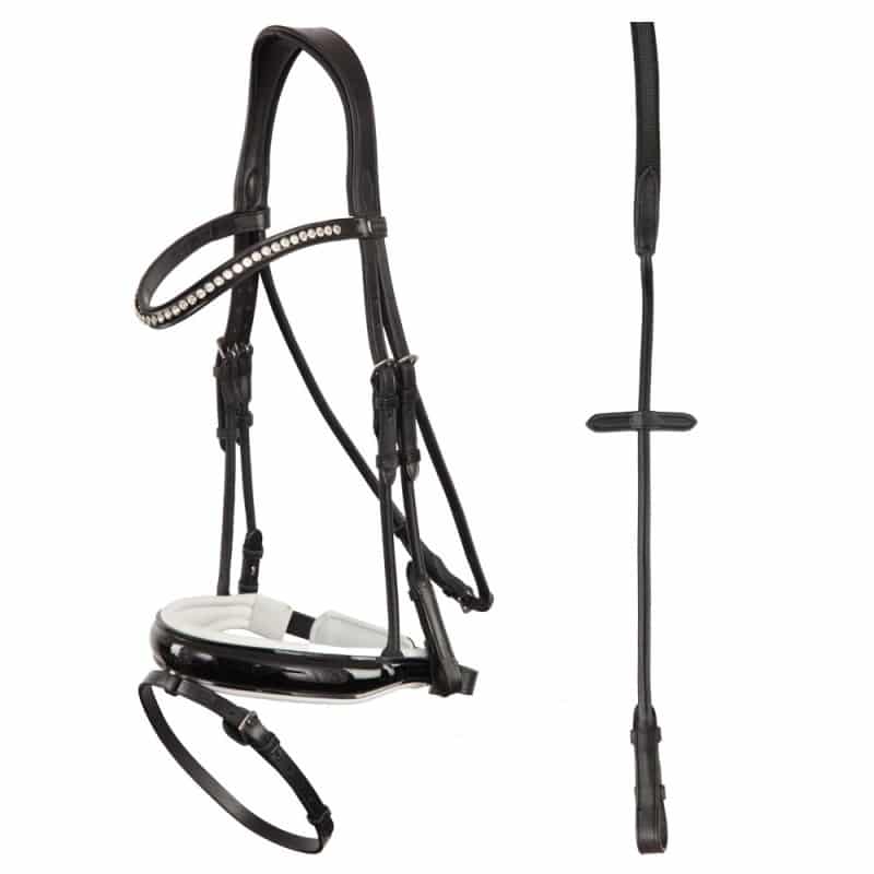 La cabezada Anky tiene una frontalera estrecha y curva con brillantes piedras preciosas sintéticas en remaches firmemente fijados y revestimiento de cuero suave.