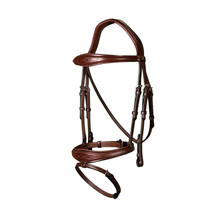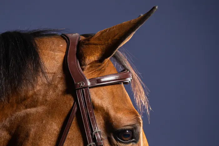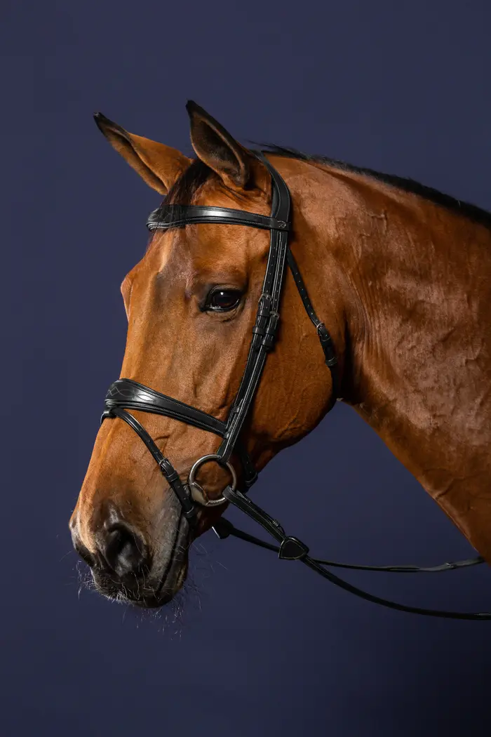 Cabezada Dyòn con Frontalera y muserola ensanchadas en el medio, ligeramente elevadas, con pespuntes decorativos Correa flash extraíble de 1/2” (13 mm)