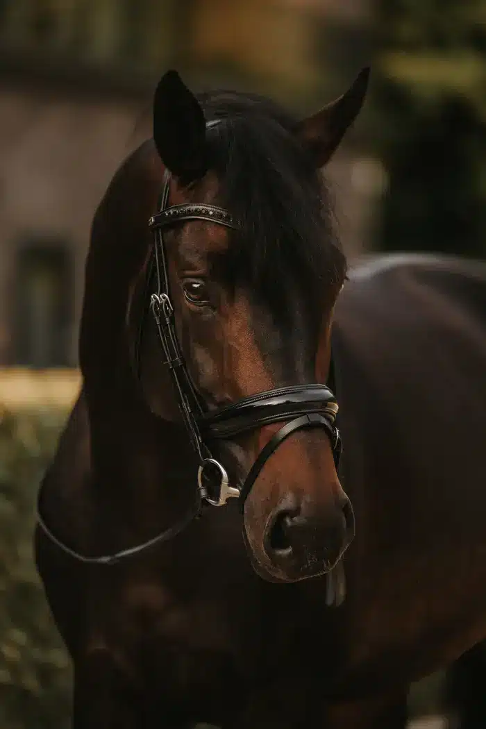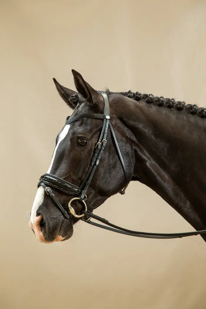 Brida con muserola de manivela grande mate con flash Frontalera flexible en forma de V Muserola anatómica y flexible Muserola disponible en cuero mate, charol o charol con forro blanco Cierre extraíble montado sobre un respaldo protector acolchado Flash desmontable de 1/2” (13 mm)
