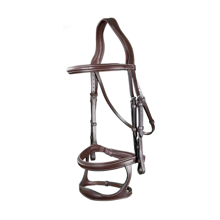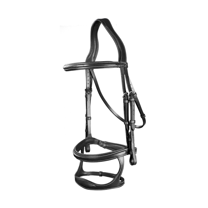 Frontalera ligeramente cuadrada con pespuntes decorativos. Filete 2 en 1 y muserola caída. Según el efecto deseado, se puede utilizar la versión filete o caída (efecto de la muserola caída sin sus ataduras para no presionar las comisuras de la boca). Hebilla de la muserola montada sobre un soporte protector de cuero acolchado Parte delantera de la muserola caída hecha de cuero extra flexible