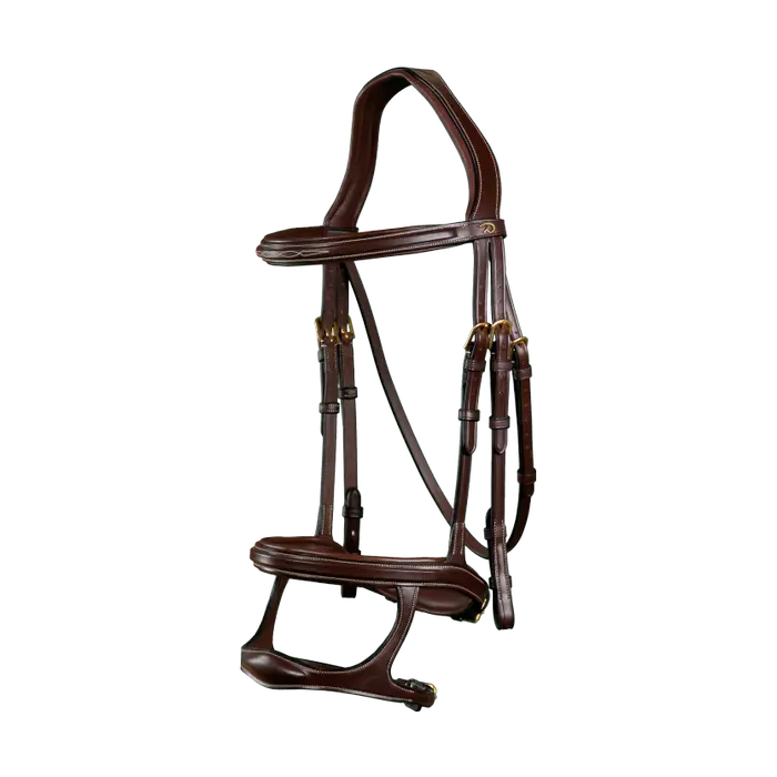 Frontalera ligeramente cuadrada con pespuntes decorativos. Filete 2 en 1 y muserola caída. Según el efecto deseado, se puede utilizar la versión filete o caída (efecto de la muserola caída sin sus ataduras para no presionar las comisuras de la boca). Hebilla de la muserola montada sobre un soporte protector de cuero acolchado Parte delantera de la muserola caída hecha de cuero extra flexible