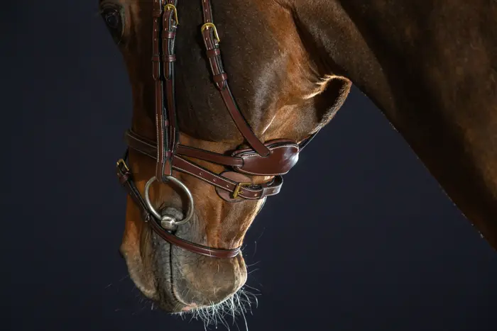 Casco y frontalera hechos de una pieza para aliviar la presión en la nuca (primera y segunda vértebra cervical) Sistema exclusivo de cierre de garganta vinculado a la muserola para garantizar que el casco quede detrás de la segunda vértebra cervical (este cierre de garganta debe ajustarse cómodamente contra las mejillas) 1/ Correa flash de 2” (13 mm) No adecuada para caballos que no muestran signos de problemas vertebrales cervicales en la primera y segunda posición. Consulte a su veterinario.