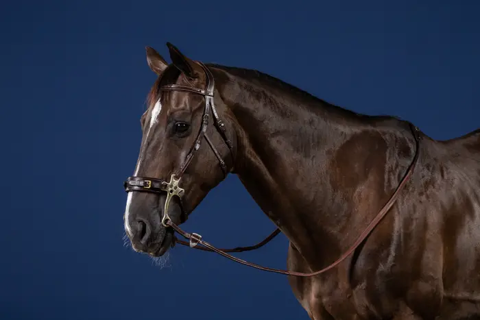 Frontalera ligeramente elevada en forma cuadrada con pespuntes decorativos. La pieza para la cabeza tiene una sola carrillera para el hackamore. Carrilleras Hackamore con correa ajustable debajo de las mejillas para mantenerlas en su lugar.