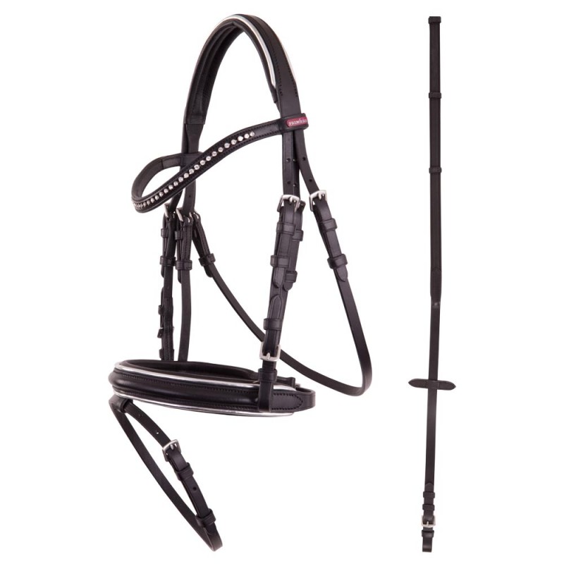 Esta cabezada de pony simétrica está hecha de cuero bellamente acabado. Su tocado suavemente acolchado se recorta alrededor de las orejas y se adorna con ribetes de charol de color. La banda de la frente estrecha y curva está incrustada con diamantes de imitación de colores y cuenta con un suave revestimiento de piel. La garganta puede ajustarse en ambos lados y las mejillas están equipadas con hebillas. La brida tiene una banda nasal de flash (aprox. 3 cm), que está adornada con ribetes de doble charol en color de contraste, similar a la pieza para la cabeza. La banda de la nariz es redonda y acolchada suavemente. La brida presenta accesorios brillantes de color plateado hechos de acero inoxidable y viene con riendas de agarre de tela en un color a juego. Las riendas están entretejidas con goma para un agarre adicional. Las riendas tienen paradas de mano y rienda y tienen 17 mm de ancho.