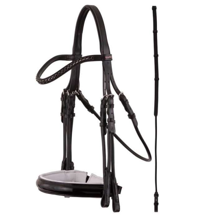 La brida se suministra con riendas de cuero de doma (16 mm) con goma, topes de cuero para la mano y extremos de cuero cosidos con pernos de gancho.