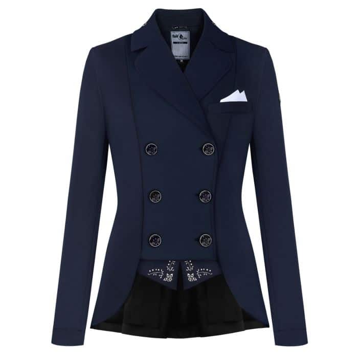 El frac corto es especial para la doma clásica y tiene una doble fila de botones y una cremallera oculta para garantizar un ajuste seguro.