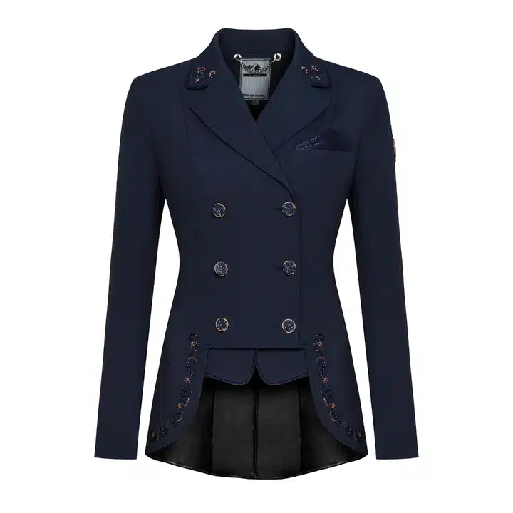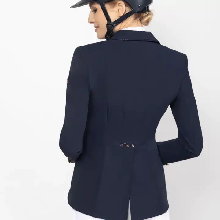 Elegante chaqueta tipo semi-frac de doble botonadura que se ajusta a la cintura y enfatiza la silueta.