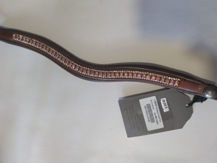 • Frontalera curva con cadena de diamantes de imitación extragrandes en color rosa y blanco. La frontalera tiene un forro de cuero suave.