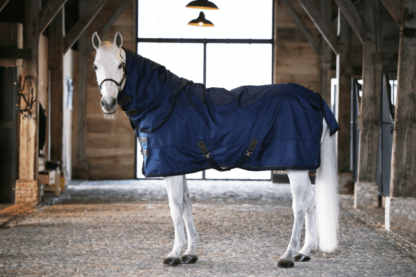 La Manta exterior Kentucky 300gr cuenta con dos cierres delanteros clásicos combinados con un fuerte cierre de velcro, dos estrías y un cordón elástico y desmontable con una cubierta de plástico (para facilitar la limpieza). La solapa de la cola ofrece protección extra y calidez.