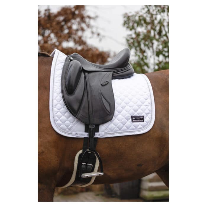Gracias a los detalles de silicona circulares y transparentes en el exterior, el sillín permanece firmemente en su lugar. Además, el parche de cuero PU y los bucles de doble cincha aseguran una posición más estable de las correas de cincha. La almohadilla está acabada con un ribete plateado brillante de imitación de diamantes, rodeado por un ribete de cordón en ambos lados. La forma anatómica asegura que la mantilla caiga bien sobre la espalda y permanezca en su lugar.