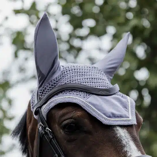 El terciopelo protege las orejas del caballo contra las moscas mientras monta.