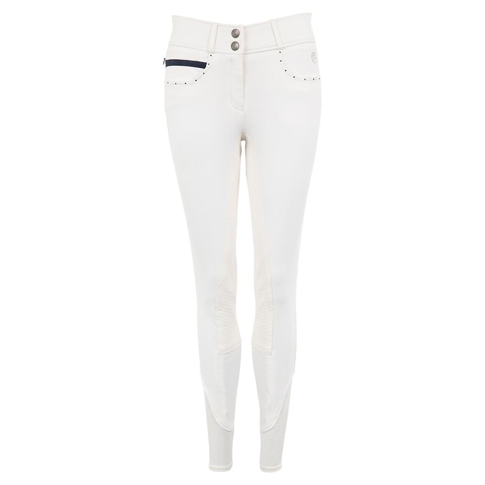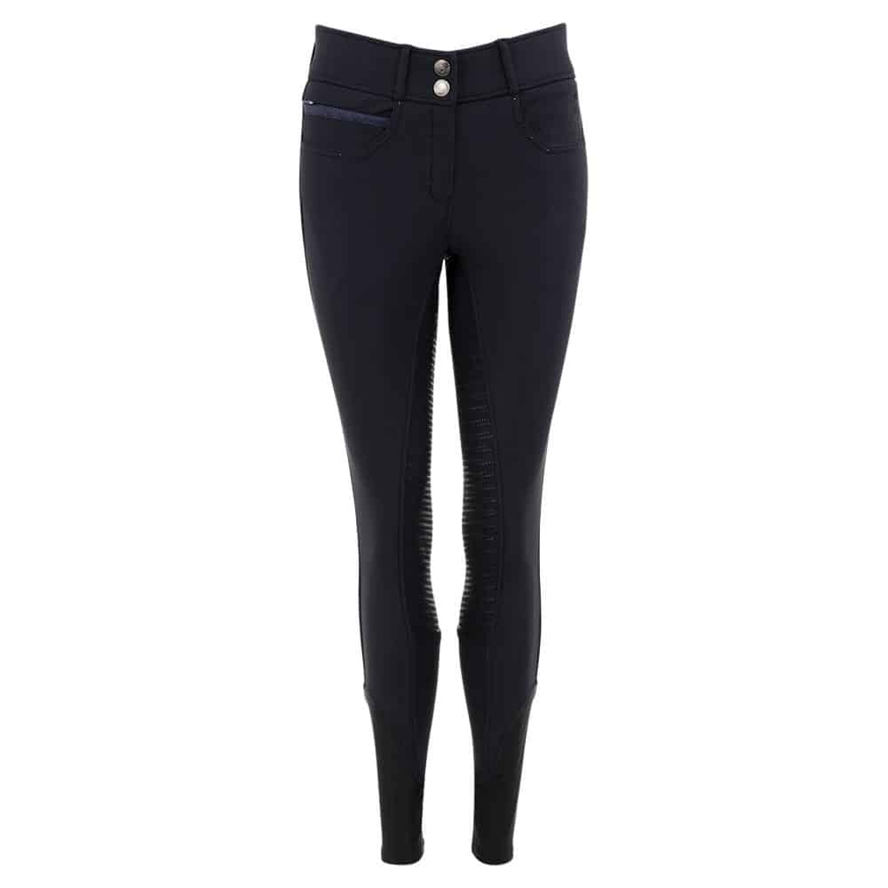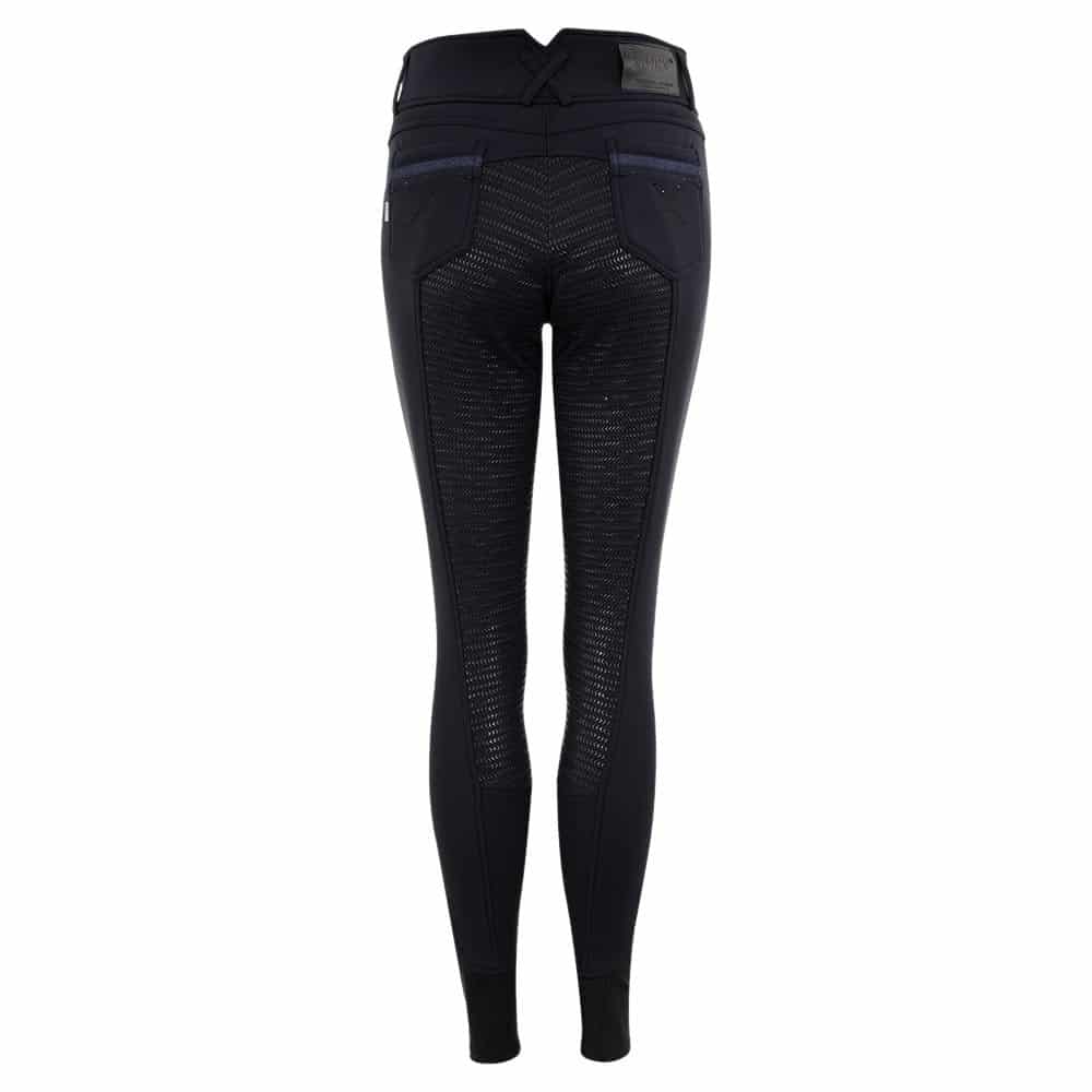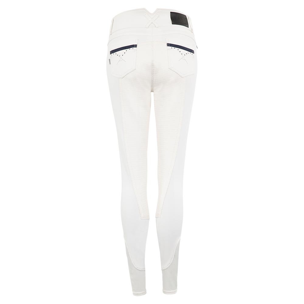 El Pantalon Stone Taped Anky con asiento de silicona tienen un aspecto elegante con pedrería de color azul en los bolsillos delanteros y traseros. En la parte delantera derecha hay un pequeño bolsillo con una cremallera oculta cubierta por una banda decorativa azul. Además, los pantalones de montar tienen dos cierres delanteros de gancho y ojo y un logo ANKY® bordado en plata en la parte delantera.