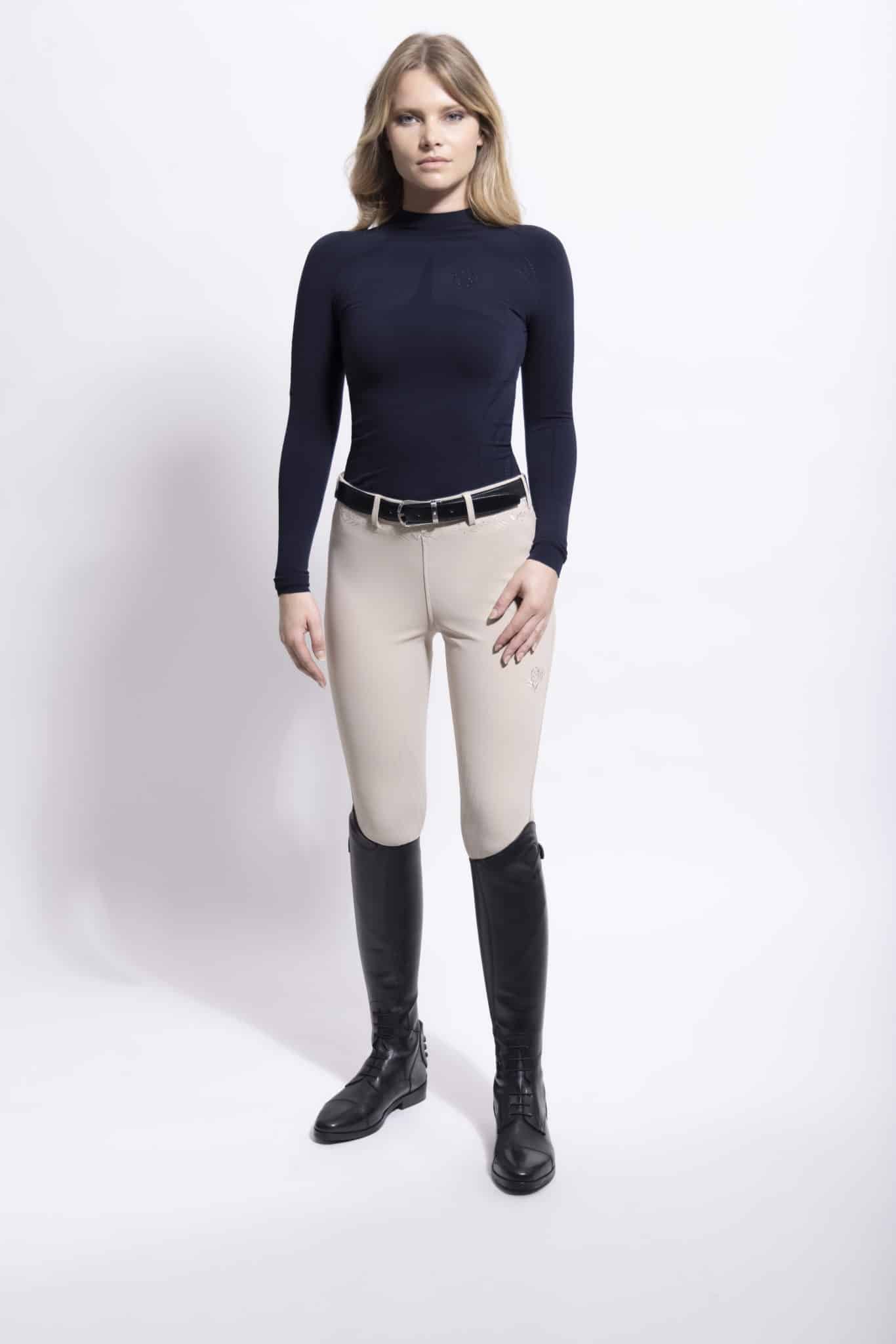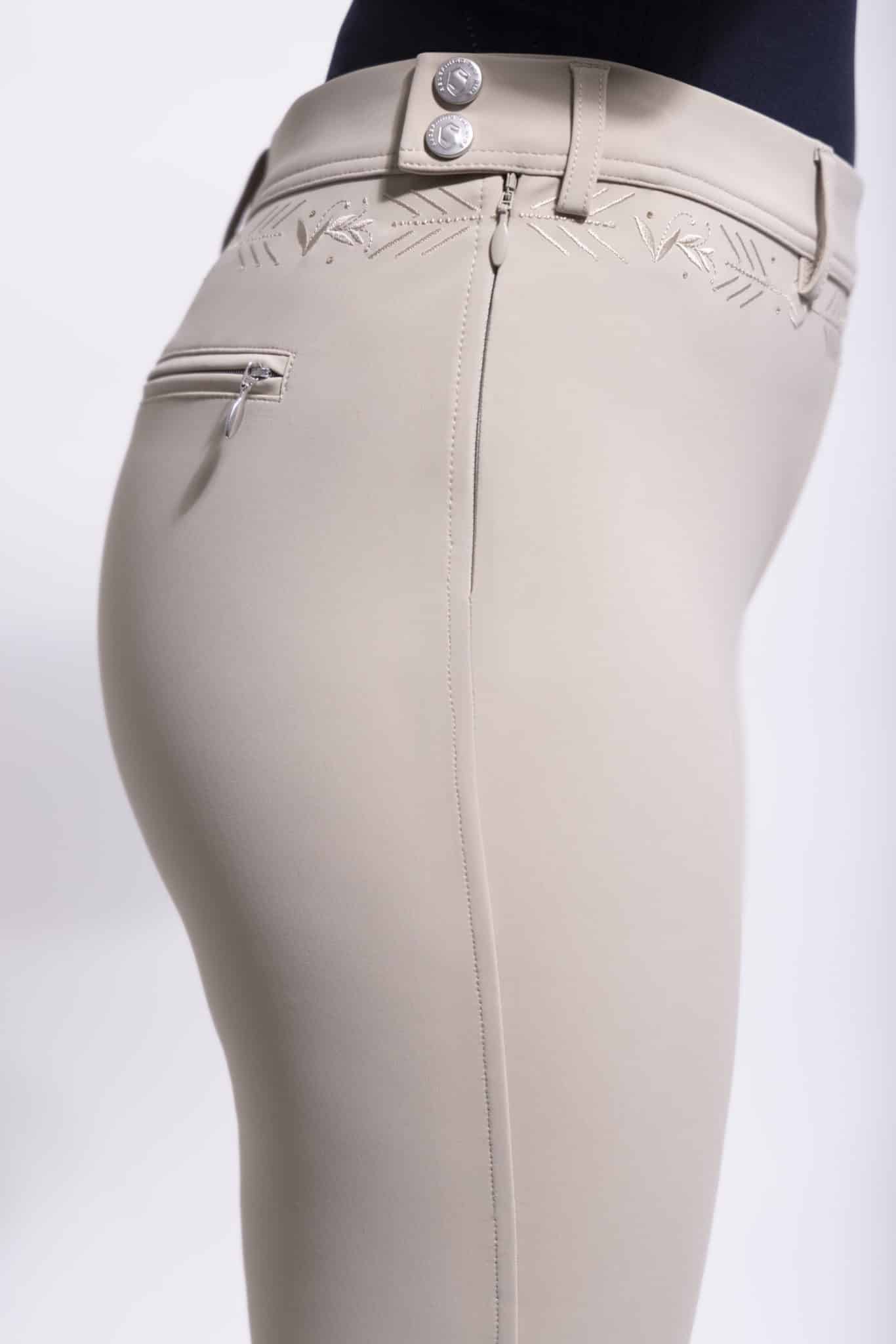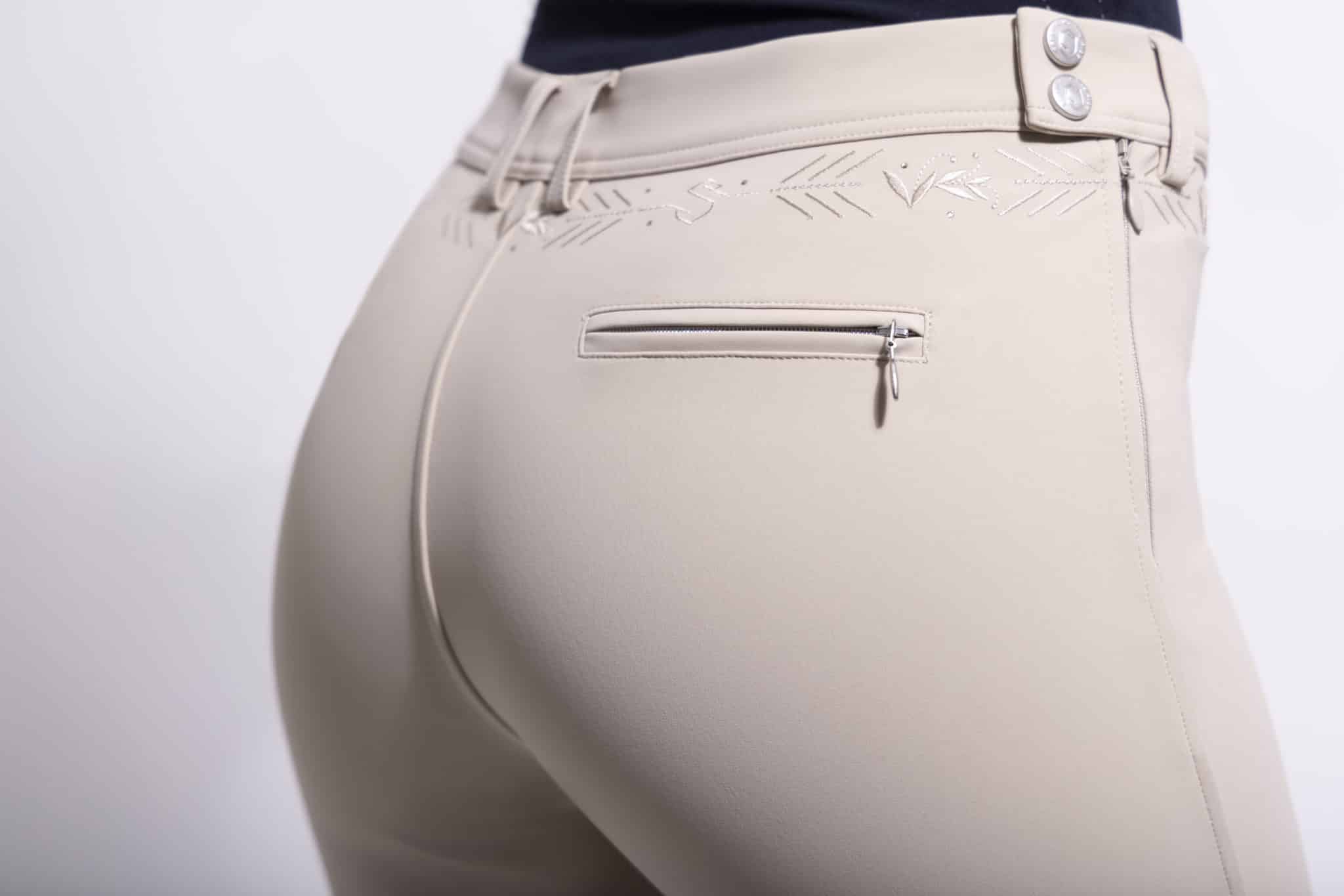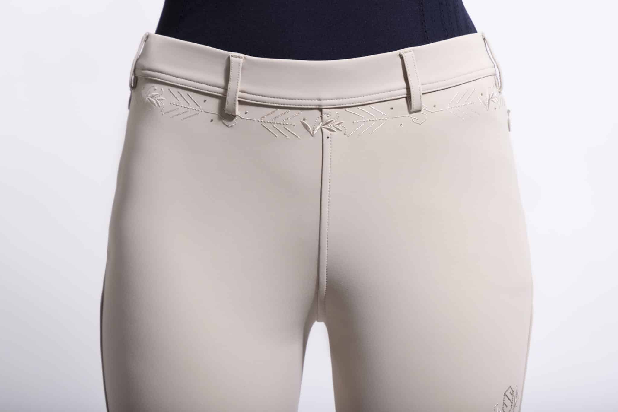 Los pantalones JULLY KNEE GRIP SAMSHIELD    aporta comodidad, elegancia y tecnicismo a las amazonas con su ajuste ceñido. Confeccionados con un material elástico muy resistente que es a la vez antidesgaste y antideslizante, los pantalones Jully ofrecen un efecto de segunda piel para un ajuste y comodidad óptimos. El tejido elástico altamente transpirable y cortaviento asegura comodidad y ventilación. El agarre total proporciona estabilidad y comodidad de conducción. El material permite bajo compresión de las pantorrillas un perfecto soporte del pantalón. El elástico dentro de la cintura está equipado con un agarre para evitar que la camiseta se suba. El tratamiento anti-UV protege la piel de los rayos ultravioleta. Los pantalones Jully aseguran elegancia y feminidad a las jinetes con sus bordados y cristales Swarovski® que rodean la cintura. El logo en cristales Swarovski® y bordado en el muslo, añade refinamiento a este modelo. En cuanto al cierre en el lateral del pantalón, afirma la perfección y refinamiento de este modelo Jully.