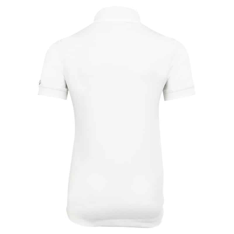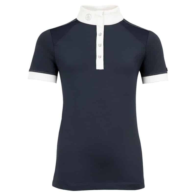 Esta elegante y elástica camiseta de competición para niños de manga corta destaca por la malla en la parte delantera, las costuras plateadas en contraste y los tres botones automáticos con purpurina. Se pueden encontrar dos botones de presión ocultos en el cuello.