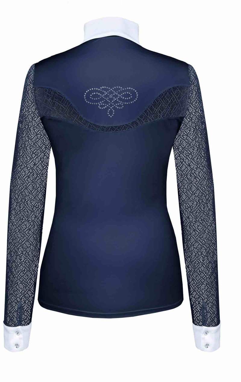 Top Equitacion  para mujer manga larga.Con botonadura cristal  y mangas y espalda de encaje. Chispas de cristales en espalda y pecho. Lavable a maquina.