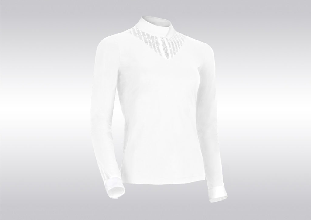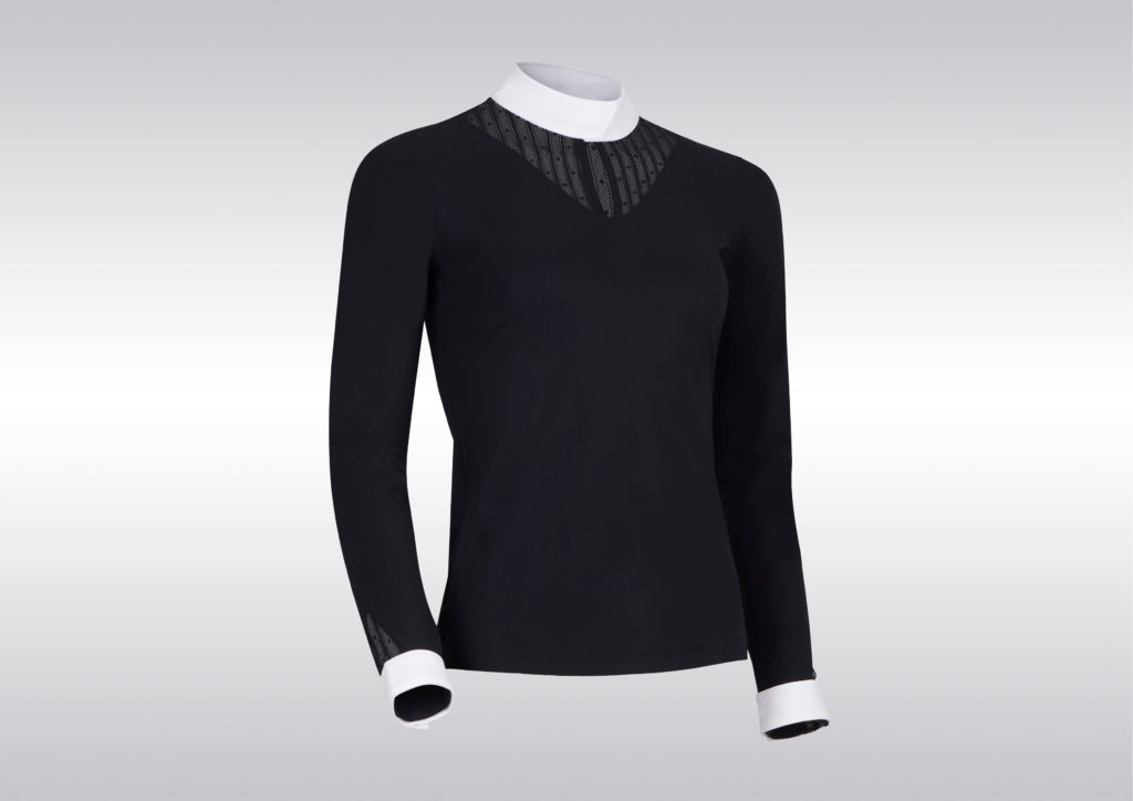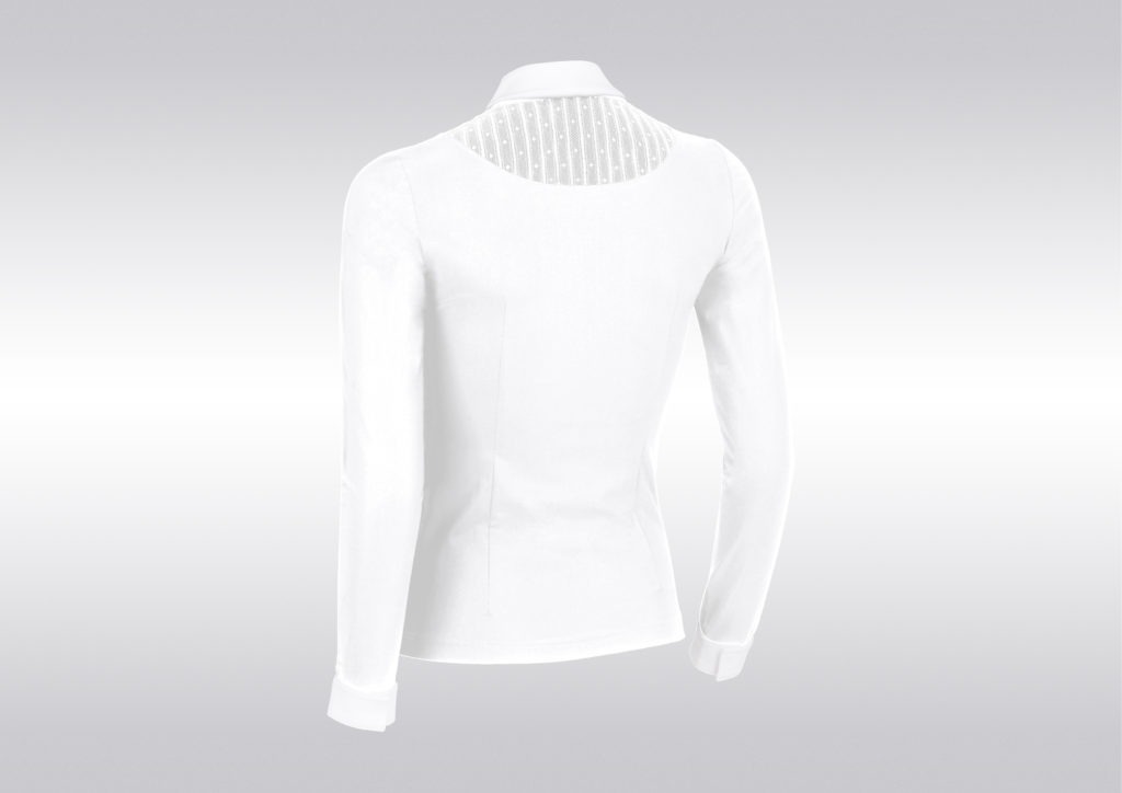La camisa de manga larga Béatrice está diseñada con un tejido ultra elástico, muy transpirable, muy cómodo y suave al tacto que garantiza libertad de movimiento y durabilidad. El cuello y los puños se cierran con broches invisibles. Ofrece protección UV gracias a la especial construcción del tejido. La camisa Béatrice está decorada con encaje en el cuello y las mangas y con un blasón Samshield hecho con cristales Swarovski® en una manga. Combina tecnicidad y refinamiento.