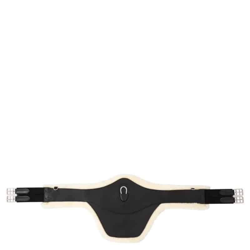 Esta cincha para caballo de salto es de forma anatómica con protector de tachuelas de cuero presenta una piel de oveja sintética desmontable especialmente adecuada para caballos con piel sensible.
