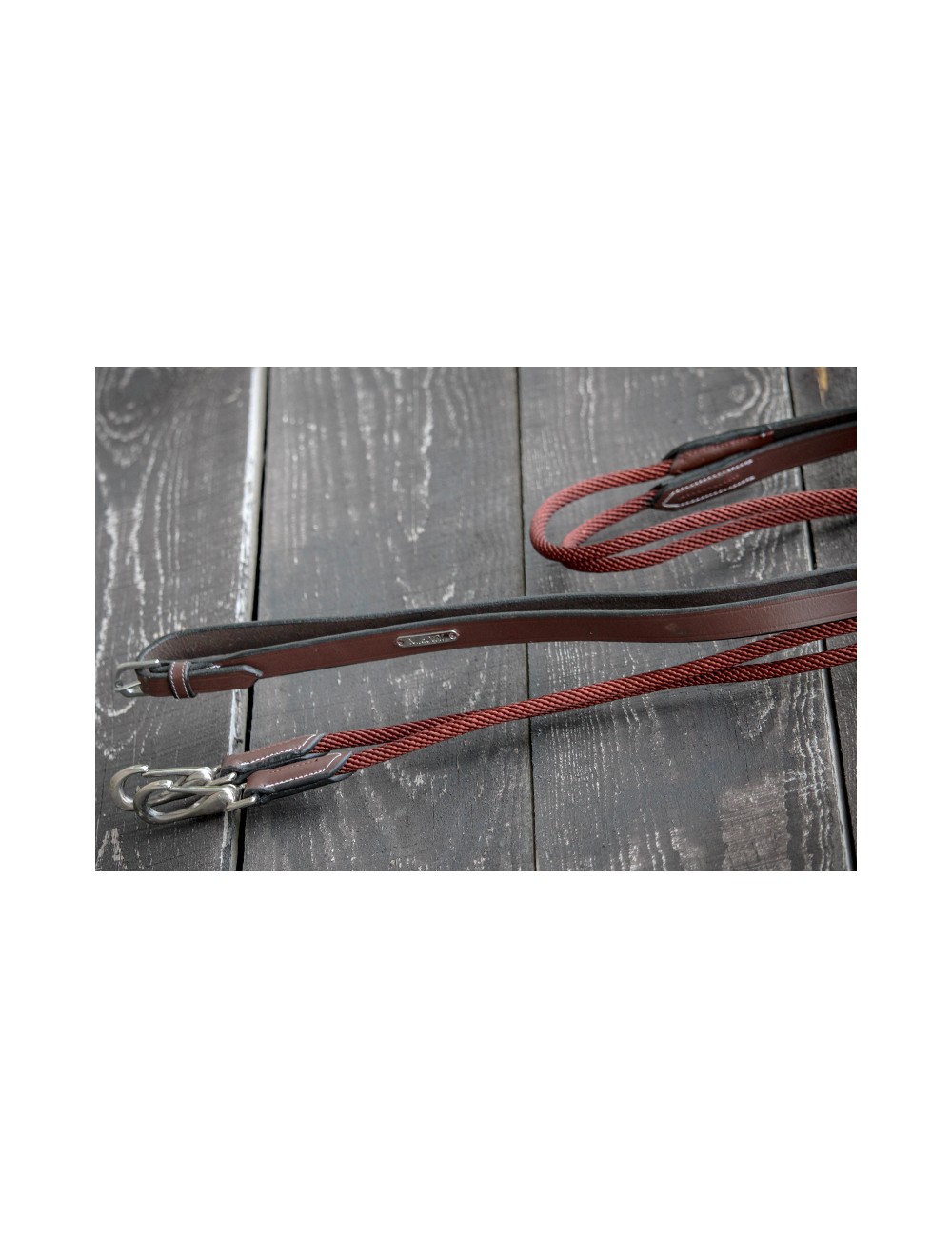 Las riendas de cuerda y cuero One Jump’In están fabricadas mitad de cuero plano y mitad de cuerda de nailon , lo que permite que las riendas se deslicen mejor en los anillos de la broca.