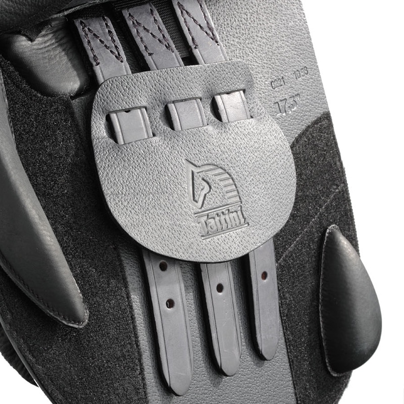 Sus rodilleras y tacos traseros ajustables con velcro aseguran la mejor posición y brindan una gran seguridad y control al jinete.